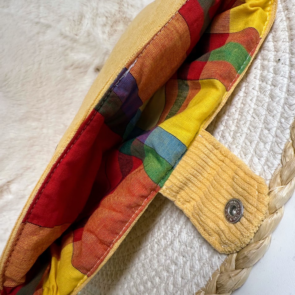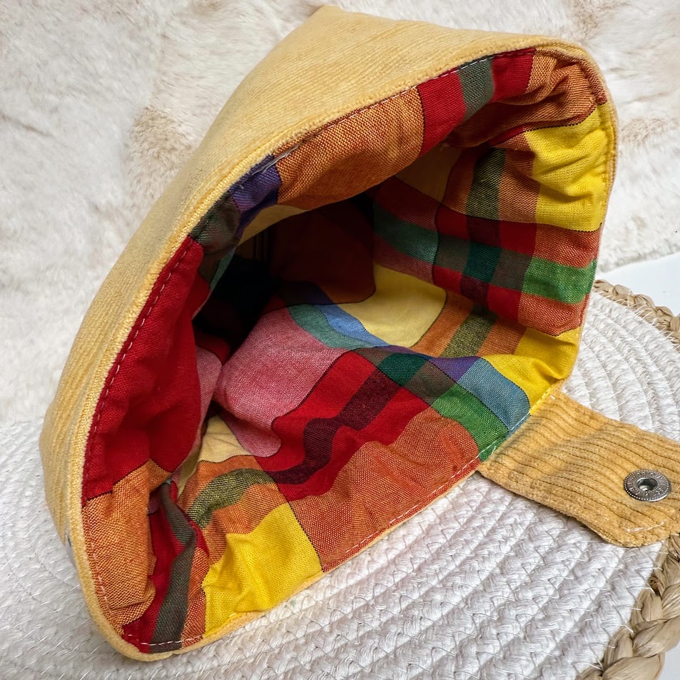 Le tissu extérieur en velours côtelé jaune, doux et résistant, est sublimé par un intérieur en coton madras coloré, pour une touche authentique et chaleureuse.