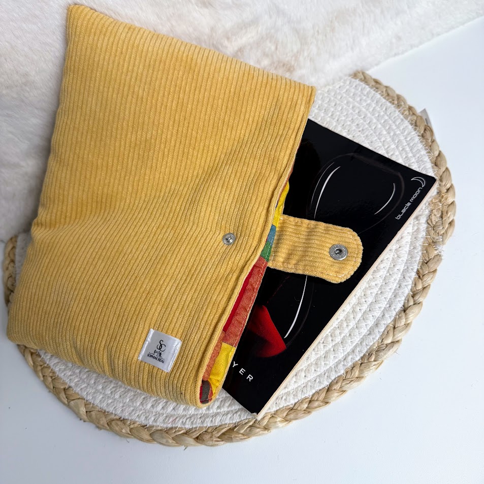 Apportez du soleil et du style à vos lectures avec cette pochette à livre velours côtelé jaune et tissu madras, signée Sophiacréas « Esprit Kréyol ».