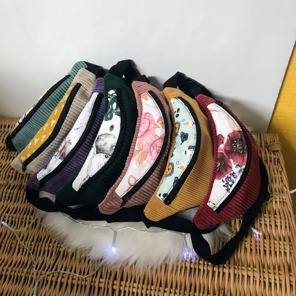 Un sac banane en velours côtelé, spécialement conçu pour les enfants.